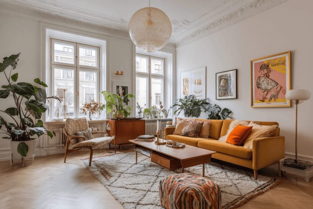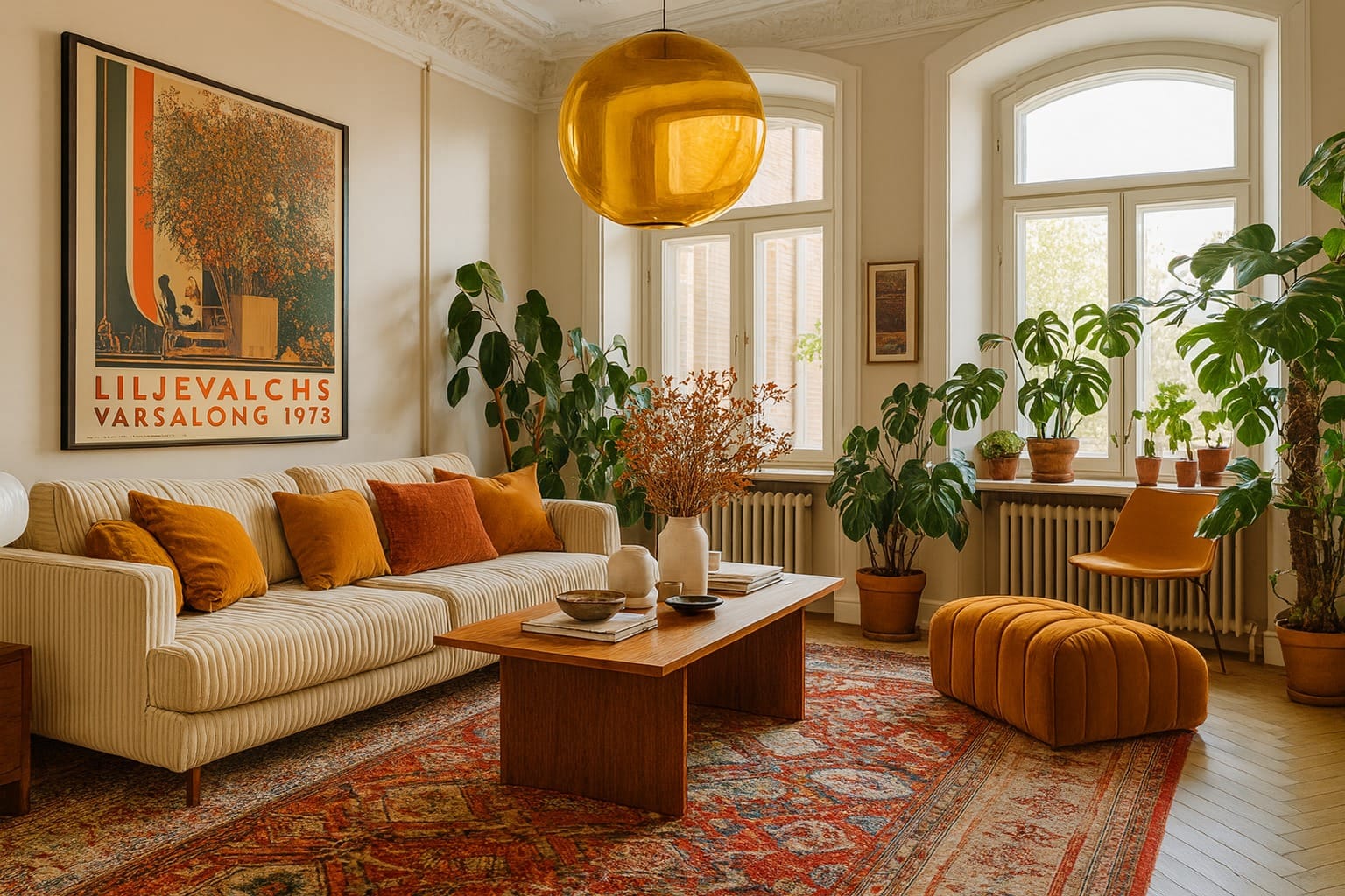 Tänk senapsgult, orange, brunt och grönt i jordnära nyanser. Mjuka former, teakmöbler, glasdetaljer och mustiga textilier. 70-talsstilen bjuder på en perfekt balans mellan retro och hemtrevligt, och skapar ett hem där man verkligen vill stanna kvar.