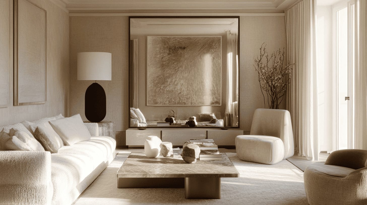 I hela hemmet syns en återhållsam färgpalett i kräm, beige och gråtoner. Att jobba ton i ton skapar ett harmoniskt och lyxigt intryck – perfekt för dig som vill ha ett stilrent hem utan att det känns stelt.
