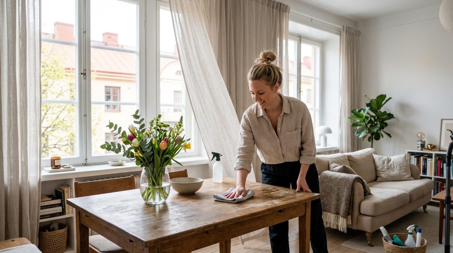 Avsluta med något som förstärker resultatet – färska blommor, nytvättade textilier eller en kopp kaffe i det nystädade rummet.