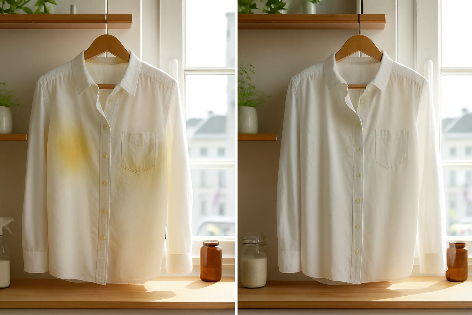 Blanda vatten och varm vinäger i en sprayflaska. Spraya plagget direkt när du tar av det – även om du inte hinner tvätta direkt. Vinägern neutraliserar svettlukt och hjälper till att lösa upp fläcken.