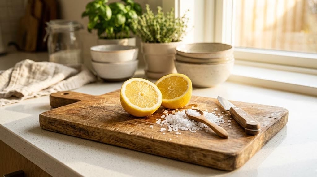 Ibland krävs det något alldeles extra för att få bort envisa dofter från exempelvis lök eller vitlök som bitit sig fast i träfibrerna. Då är skafferiet den absolut bästa hjälpen! Genom att pressa ut saften från en halv citron direkt över brädan och därefter gnugga in den med själva citronhalvan får ytan en naturlig och ljuvligt doftande skrubb. Strö därefter ett generöst lager vanligt salt över hela ytan och gnugga en gång till med citronen. Detta ger en fantastisk peelingeffekt som lyfter smutsen ur de små skårorna som knivarna skapat. Efter att den härliga blandningen fått verka i ungefär en kvart är det bara att skölja av noga och låta träet torka. Resultatet blir en skinande ren yta redo för nästa goda måltid.